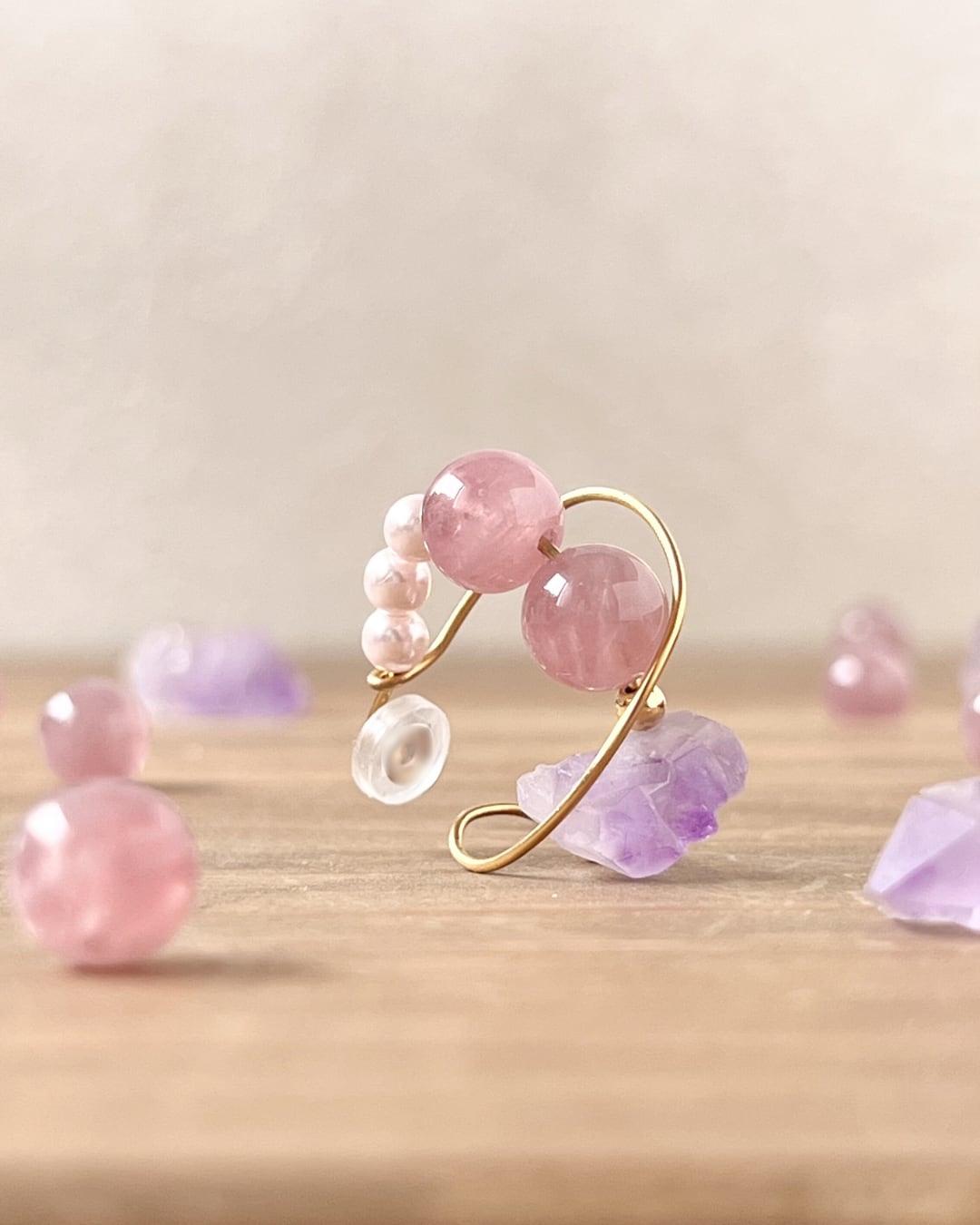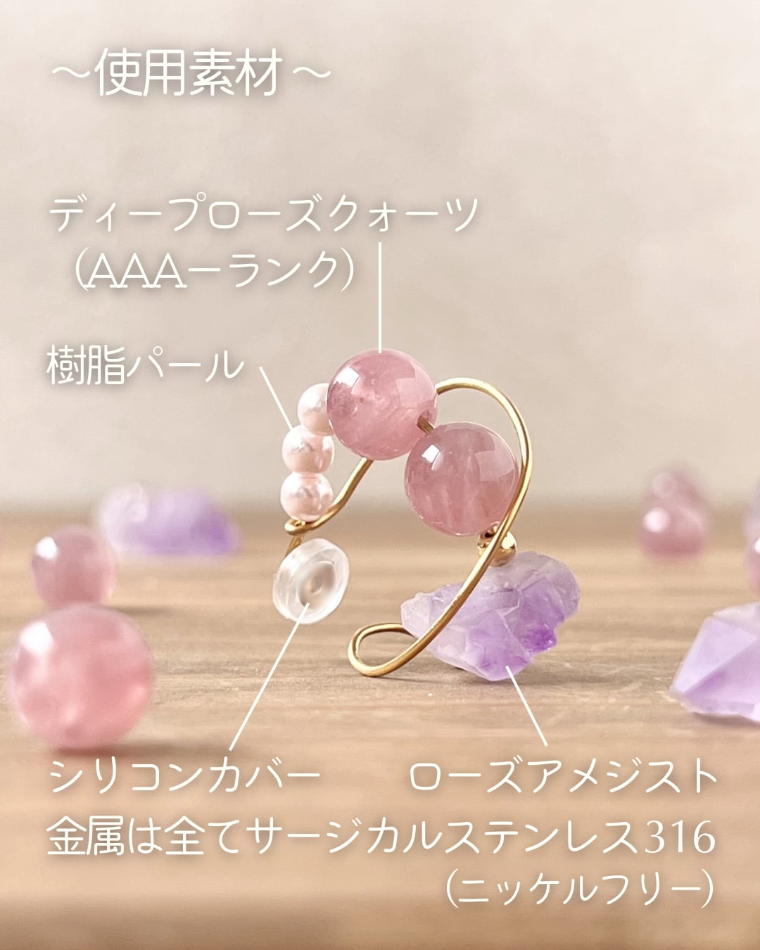 ディープローズクォーツとローズアメジストの耳にフィットするイヤーカフ
